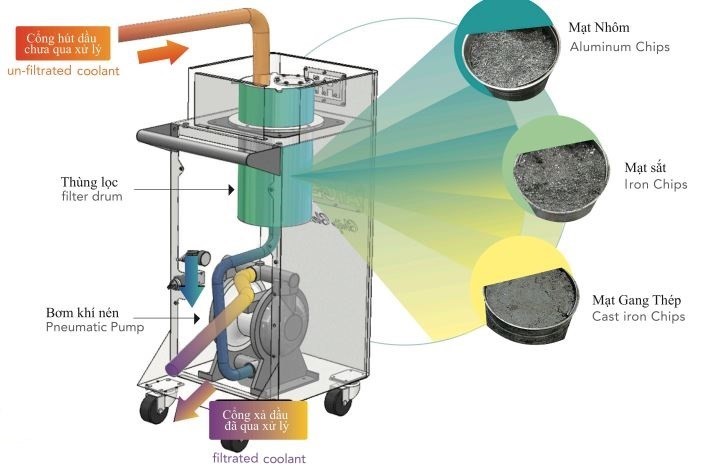 Thiết bị xử lý mạt sắt và bùn lắng của AiOLOS gọn gàng với trọng lượng 75 – 80 kg có thể di chuyển dễ dangfcho nhiều máy CNC. Mang lại hiệu quả, dễ sử dụng, vận hành bằng khí nén, thích hợp với nhiều loại máy tiện, phay, mài và gia công EDM…